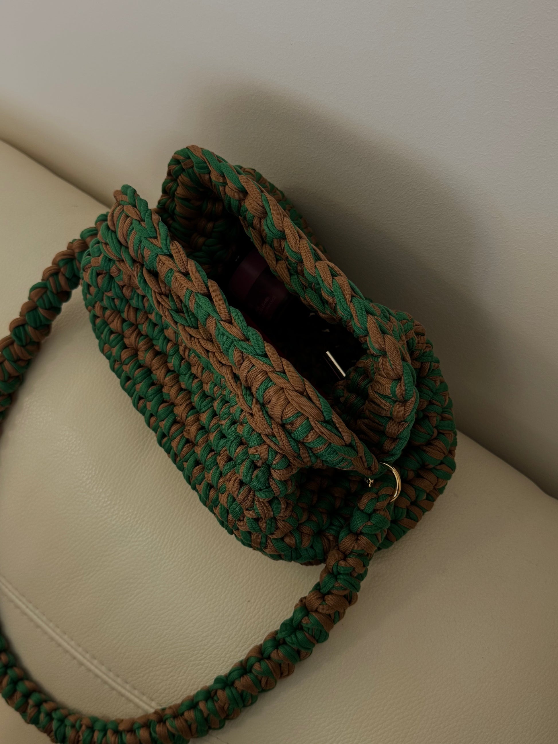 Minimal and sturdy, this crochet bag is crafted from thick textile strings for a bold, structured look. Perfect for everyday essentials or summer markets. It holds its shape well and is easy to carry by hand.